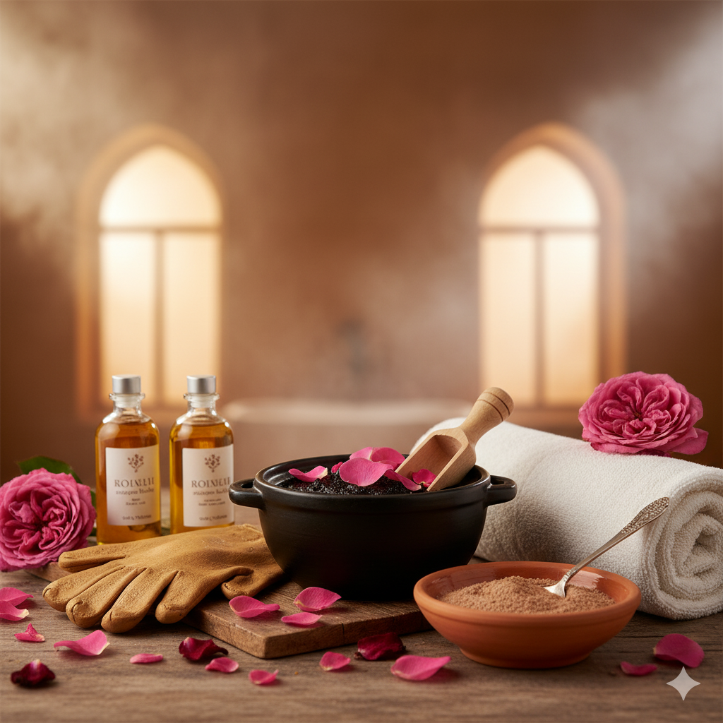 🌹 الحمام المغربي بالورد: فخامة النقاء وعبير الرومانسية